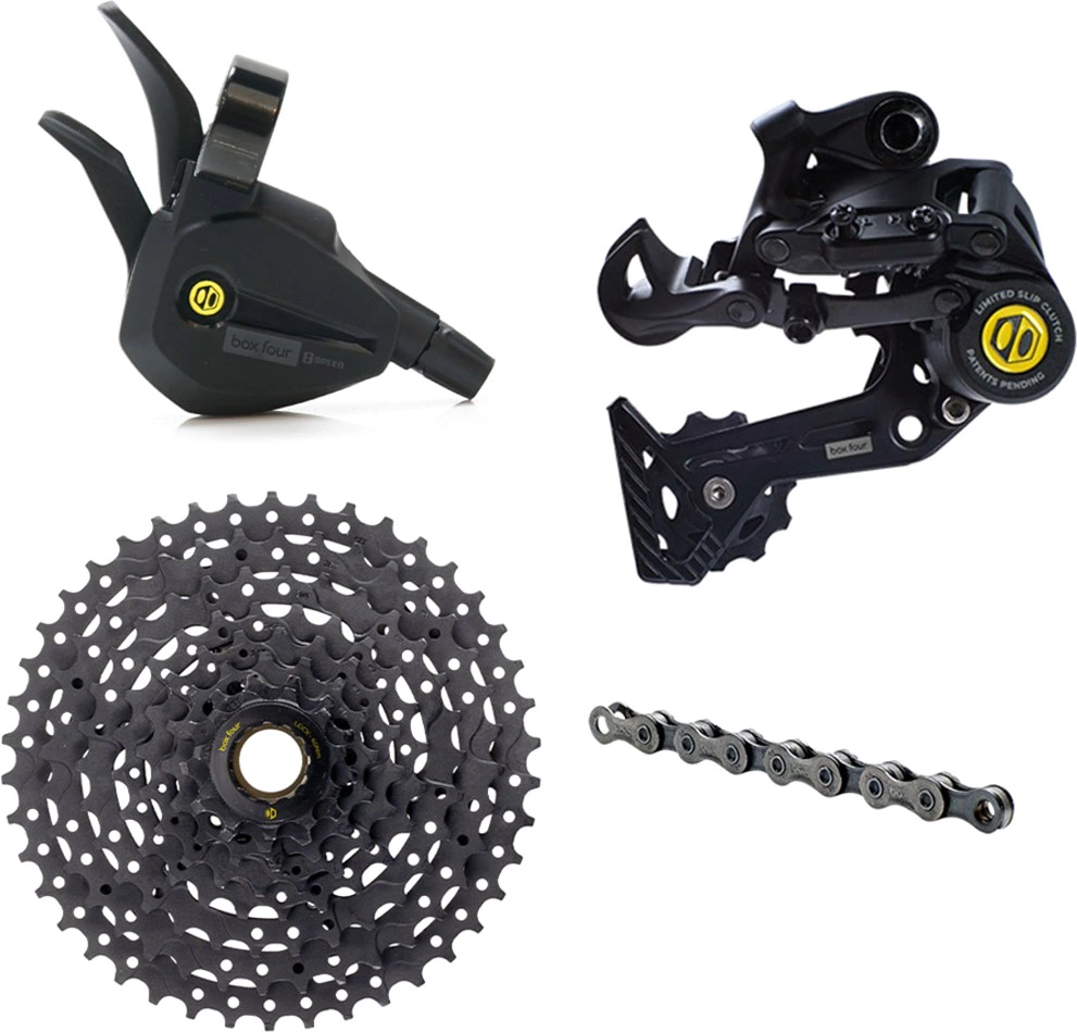 Die Box Four Gruppe ist für Fahrer konzipiert, die weniger Aufwand wollen. Sie verfügt über einen 8-fach-Schalthebel und eine 11-42-Zähne-Kassette, die eine große Auswahl an Übersetzungen bietet, um den Anforderungen Ihrer Offroad-Abenteuer gerecht zu werden. Der hintere Mech wurde für reibungslose Leistung entwickelt und verwendet eine Limited Slip-Kupplung in einem kompakten Käfig. Ein letztes Highlight ist die benutzerdefinierte 8-fach-Kette, die für anspruchsvolle Nutzung gebaut ist. Dies macht sie zu einer großartigen Gruppe für Fahrer, die eine starke Gruppe ohne Schnickschnack und zu einem budgetfreundlichen Preis suchen.