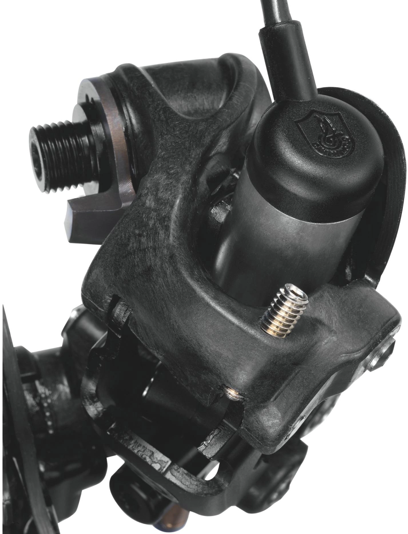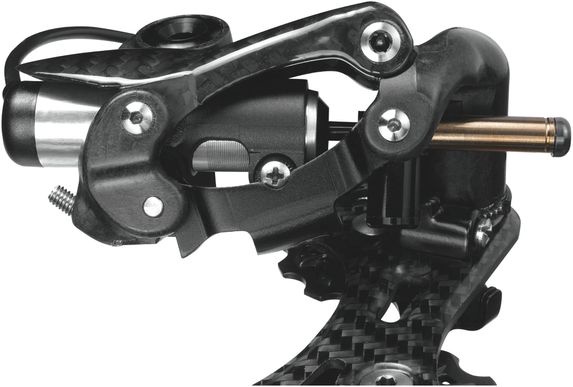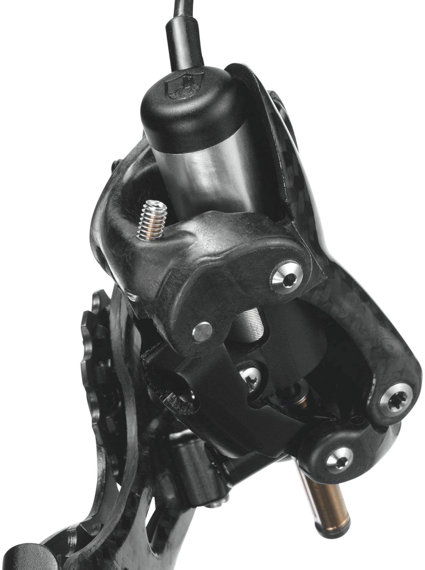 Der untere und obere Körper, das Parallelogramm und der Carbon-Schaltkäfig werden von einem System aus Schraube-Schraubenmutter ohne Ende (nicht mit Feder) bewegt, das seinerseits vom elektronischen Aktuator angetrieben wird, der mit der DTI kommuniziert. Der integrierte Resolver im Innern des Aktuators kann jederzeit die Bewegungen des Schaltwerks lesen und dessen Position durch den Dialog mit der DTI (Digital Tech Intelligence) optimieren.