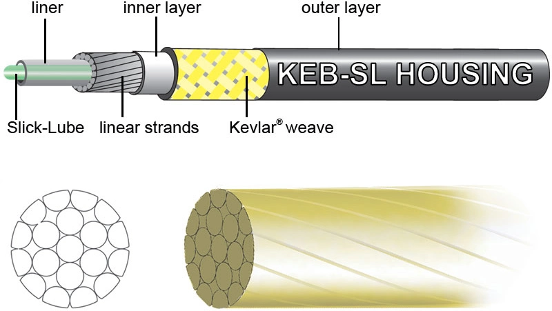 KEB-SL Outer Cable: This high-quality outer cable consists of linear strands that are Kevlar®-reinforced, and that wrap around a slick-lube liner. A major performance upgrade to coiled steel, this compressionless housing starts with a similar construction to Jagwire’s LEX shift housing that reduces weight by 30%. The woven Kevlar® layer gives the housing the strength and flexibility that is necessary for braking applications.