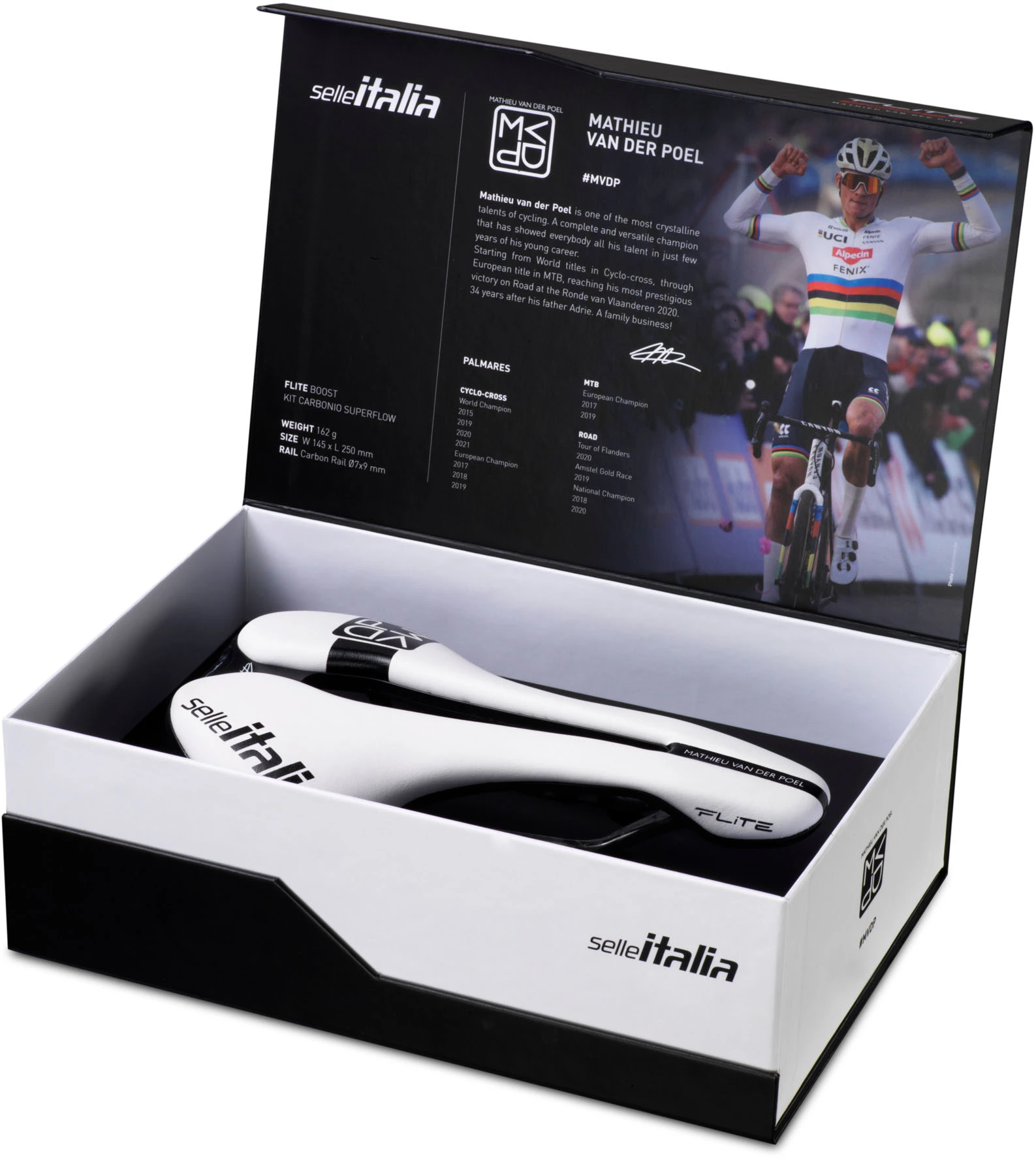 Dank der Zusammenarbeit mit einem unbestrittenen Champion wie Mathieu Van der Poel wird die Tradition auf die beste Art und Weise fortgesetzt. Außerdem ist aus dieser Partnerschaft, der Flite Boost Kit Carbonio Superflow “MVDP edition” Sattel entstanden.