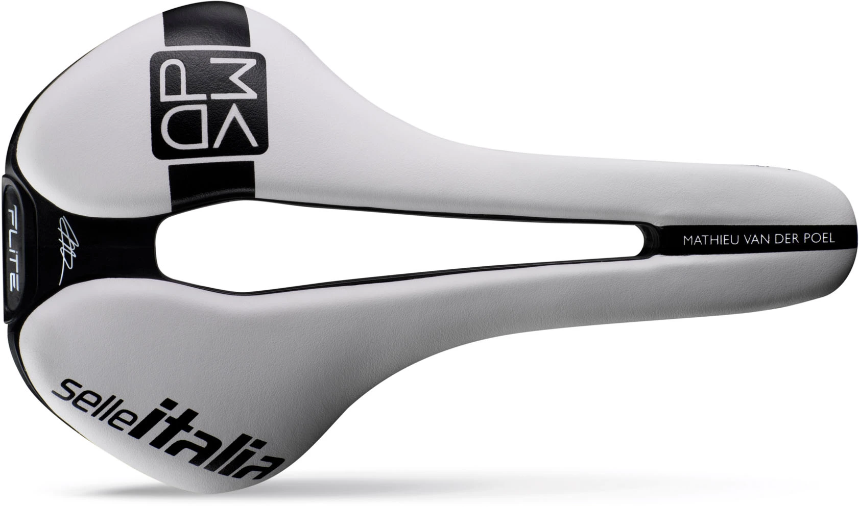 In Weiß gehalten, wie der Flite Boost, der normalerweise von Mathieu während des Rennens verwendet wird, weist der Sattel ein Logo mit dem Wort MVDP auf. (Die Initialen des Athleten)
