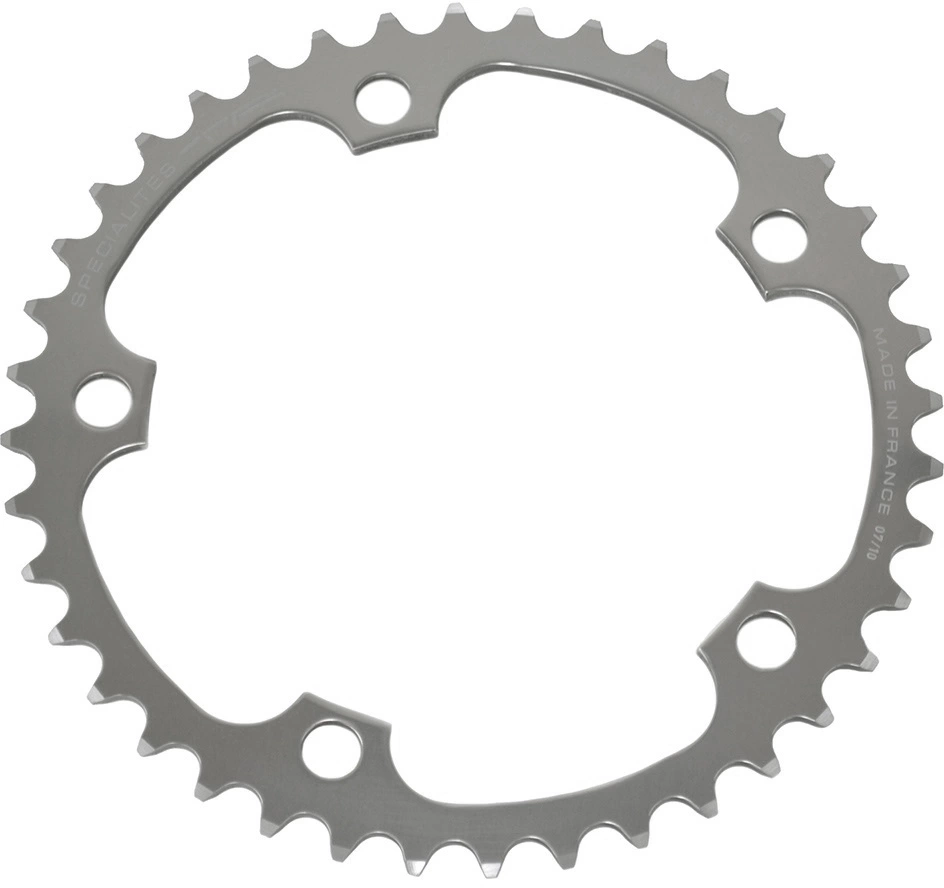Die Zähne sind nach traditioneller Art mit der Drehmaschine zugeschnitten. Das Ergebnis ist eine wesentlich bessere, genauere Zahnform als durchs Stanzen, das von den meisten Kettenblattherstellern angewandt wird.
