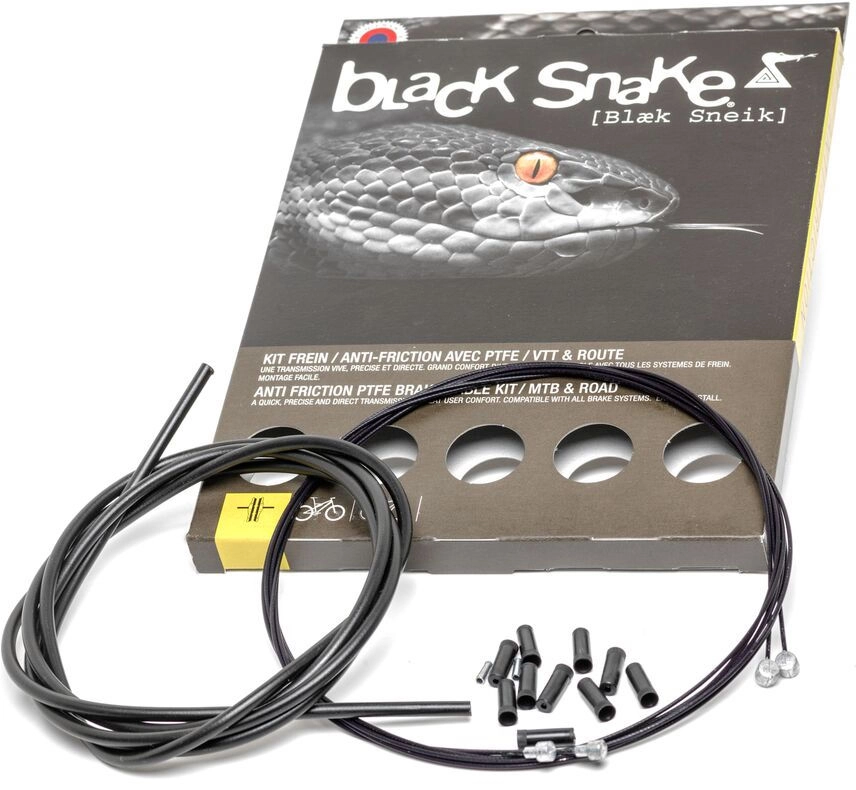 Der Black Snake Bremszugsatz verfügt über 1 + 6 + 12 äußerst widerstandsfähige, vorgedehnte, geglättete und galvanisierte Stahldrähte, die in einem exklusiven Verfahren TEFLON-beschichtet wurden. Diese komplett dichte Beschichtung ist ideal für jedes Wetter.