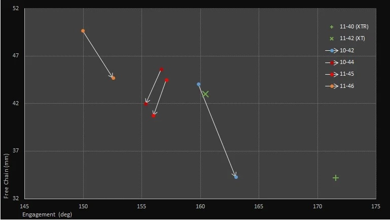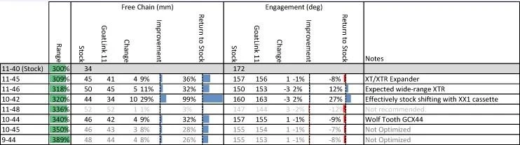 When used with a 10-42T cassette, the GoatLink 11 re-positions SLX M7000, XT M8000 and XTR M9000 rear derailleurs such that free chain length between the cassette and the top derailleur pulley is within 1% of what Shimano intended while cassette tooth engagement in the smallest cog is improved by 27%.
